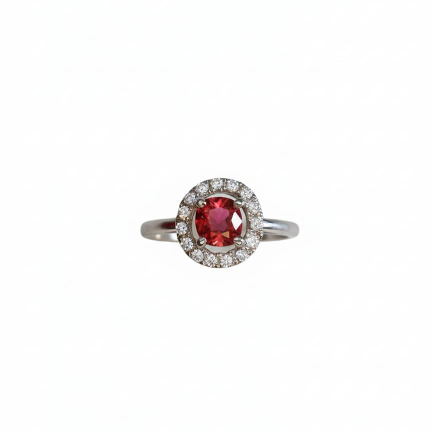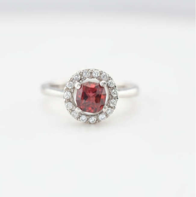 A timeless design reimagined with African elegance. This halo ring features a natural cushion-cut red garnet, glowing with rich, fiery depth. The center stone is framed by a circle of brilliant white accent stones, amplifying its sparkle and creating a luminous halo that draws every eye.