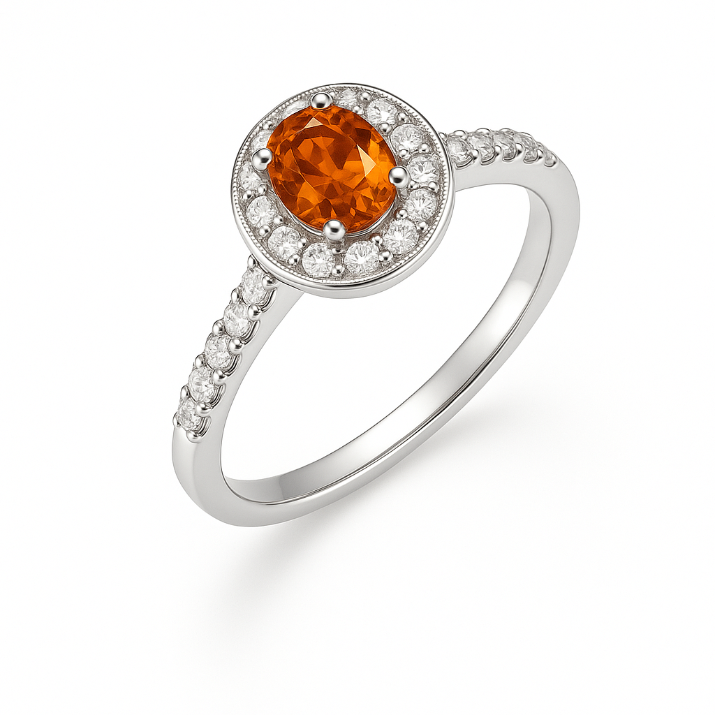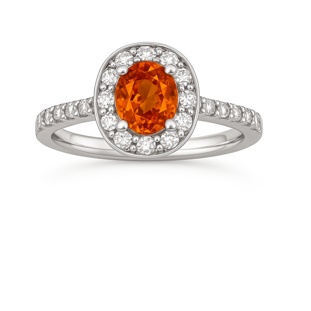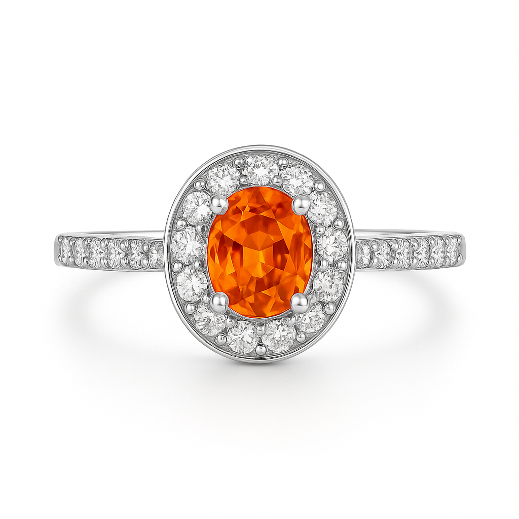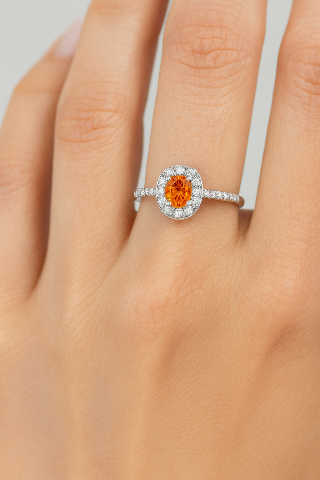 A Natural Oval orange sperssetite Engagement style Ring features an orange oval sperssetite at its center, surrounded by a radiant display of 10 sparkling white zircon stones.